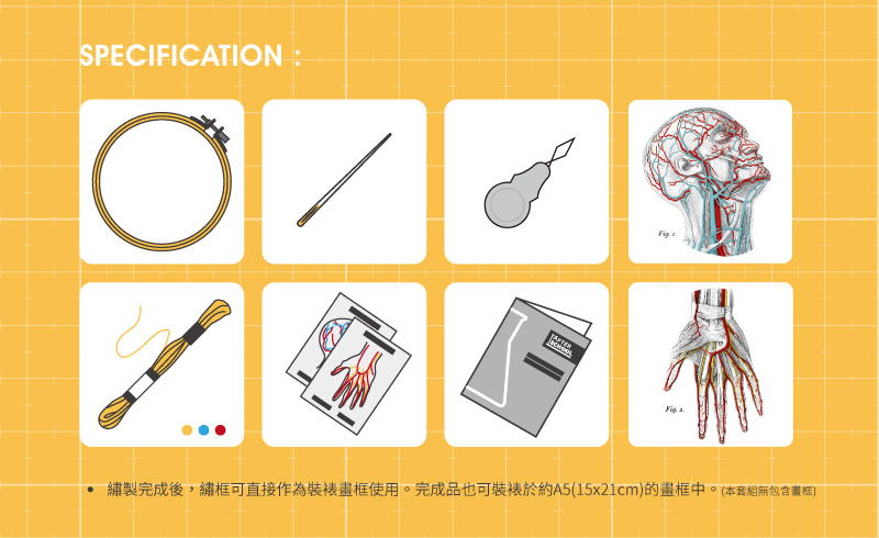 此套組包含兩張血管、神經分佈圖的精美明信片,可以依圖刺繡,也能自由發揮!